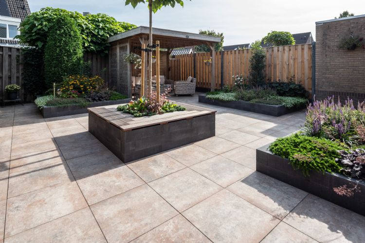 In deze moderne particuliere tuin in Hoogeveen is gekozen voor tegels van Terras & Trends, 'Allemagne Bruin Gevlamd' in de afmeting 60 x 60 cm.