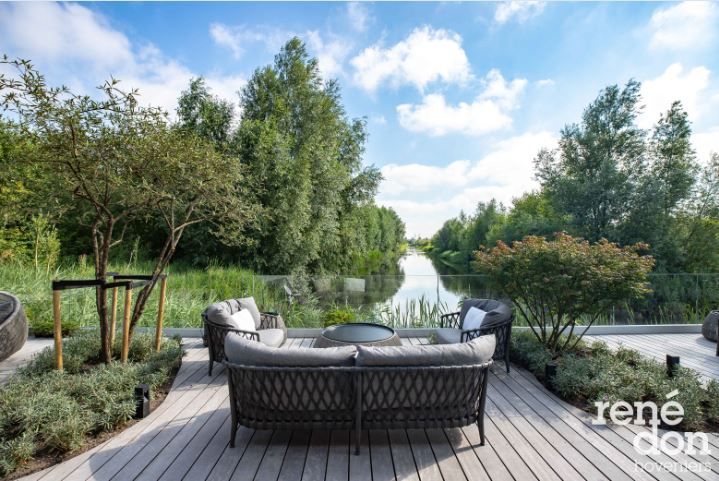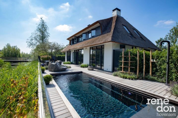 René Don Hoveniers was verantwoordelijk voor het ontwerp en de uitvoering van dit project. Martijn Poortvliet vertelt: 'Deze prachtige villa, gebouwd door Livingstone Villabouw, is omringd door natuurgebied. De tuin is hier dan ook volledig op aangepast, door het gebruik van natuurlijke materialen. Een groot deel van de tuin bestaat uit vlonder en dit deel van de tuin geeft prachtig uitzicht over het water. Daarnaast is er een zwembad met een donkere kleur in deze tuin geplaatst. Dit zorgt voor een natuurlijk effect, dat past bij de omgeving.'