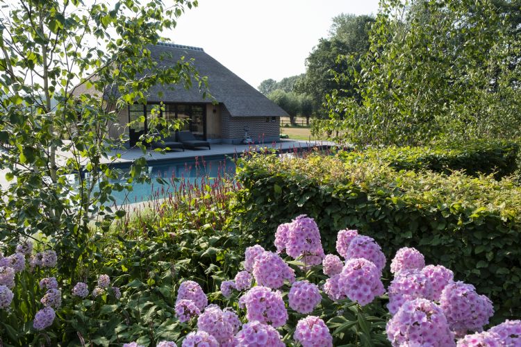 Deze klant in Epe wilde graag een gedeelte van de tuin aanvullen met een rietgedekt poolhouse en zwembad. Vos Tuinvisie heeft hiervoor een plan gemaakt en ook uitgevoerd. Het gaat om een grote woonboerderij met zo’n 16ha grond in een landelijk gebied. Er is een vrij groot zwembad met alle gemakken van dien aangelegd, een luxe poolhouse geheel van Eikenhout vervaardigd met een groot leefgedeelte met bar/gashaard, televisie, douche, toilet en slaapgelegenheid. Het gaat om een gezin met opgroeiende kinderen dus het luxe poolhouse is een ideale louncheplek en wordt veel gebruikt. Een flink terras met een ruime eettafel biedt de mogelijkheid om lekker buiten te eten bij mooi weer, daarnaast hebben we voldoende zongelegenheid gecreëerd voor ligbedden. Het geheel is aangekleed met bloeiende beplanting, de meerstammige witte Berken zijn ’s avonds ook erg mooi als de spots het licht erop schijnen. Qua bestrating hebben we gewerkt met Oud Hollands tegels van 80x80cm. Ditzelfde materiaal is als zwembadrand gebruikt om een mooie eenheid te creëren.