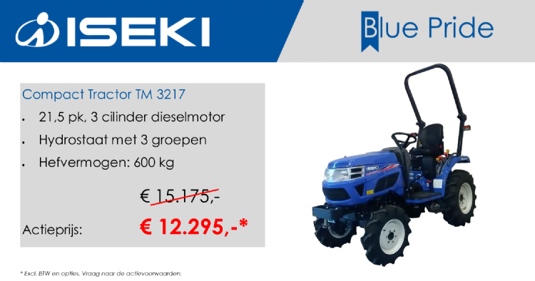 Deze allrounder beschikt over een 3 groepen transmissie, wat uniek is in deze klasse. De bediening is eenvoudig en de grote stuuruitslag maakt deze Iseki TM 3217 zeer wendbaar, waardoor u goed kan manoeuvreren in kleine ruimtes. De krachtige 24 PK dieselmotor met 3 cilinders haalt zijn vermogen al bij een laag toerental, wat zorgt voor een lager geluidsniveau. Verder heeft de TM 3217 heeft een mooi modern design, volledig uitgerust dashboard, hydrostatische aandrijving, rijsnelheid van 23 km/u brandstoftank van 28 liter en een hefinrichting met hefvermogen van 600 kg. Toepassingen De TM 3217 kan worden uitgerust met een fronthef, frontaftakas en een cabine. Verder kan deze compact tractor worden uitgerust met Iseki tussenasmaaiers, maaiers achteraan, voorlader en alle mogelijke machines voor grondbewerking. Kortom; deze sterke all round compact tractor voldoet aan alle eisen van een veeleisende (eind)gebruiker. Actieprijs: € 12.425 (gazonbanden). Excl. btw en montagekosten.