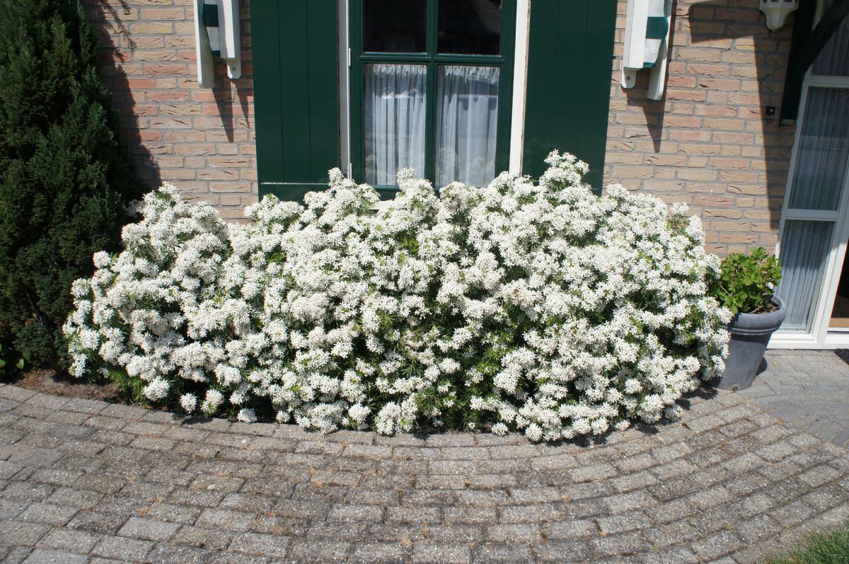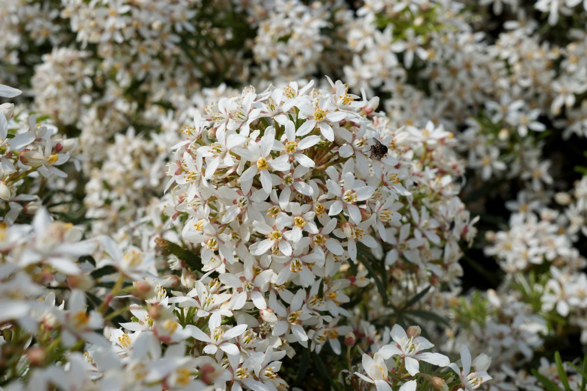 Rijnbeek adviseert de Choisya ternata ‘white dazzler’. De plant wordt af en toe al wel gebruikt door hoveniers, al zijn de Choisya ternata en de ‘aztec pearl’ bij de meesten bekender, denkt Rijnbeek. ‘White dazzler is het meest te vergelijken met de aztec pearl, maar dan in een compacte en fijnere vorm. White dazzler bloeit veel rijker. De compacte wintergroene plant wordt circa 90 cm hoog en bloeit lang, wel twee tot drie keer per jaar. De plant is bijzonder rijk en bloeit met witte, geurende bloemen in trossen.’