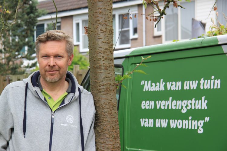 Jeroen Mars (46) is al meer dan de helft van zijn leven hovenier; 25 jaar zit hij in het vak. Voordat hij in 2010 startte met zijn eigen bedrijf Mars Hoveniers, werkte hij onder andere als bedrijfsleider, calculator, werkvoorbereider en natuurlijk hovenier. Toch was hij op zoek naar meer vrijheid; hij wilde zijn eigen ideeën kunnen uitvoeren. Dat zette hem ertoe aan zijn baan op te zeggen. Hij nam een jaar de tijd om zich voor te bereiden op de overstap naar het ondernemen. 'Dat jaar heb ik gebruikt om me te oriënteren en de financiën te regelen. Ik wilde me goed voorbereiden, zodat ik goed van start kon. En dat is gelukt. Toen ik mijn baan opzegde, had ik al een website, kaartje en telefoonnummer.' Vanaf dat moment liep het goed. 'Toen ik begon, zaten we nog volop in de crisis. Toch heb ik daar nooit last van gehad. De laatste jaren is het helemaal uit de hand gelopen; ik heb wachttijden tot oktober.' Mars doet samen met zijn collega Erwin vooral particuliere aanleg. 'We werken in principe altijd met z'n tweeën. Als het erg druk is, huur ik extra krachten in.' Op dit moment zijn de mannen druk met een klus in Koog aan de Zaan. 'Ik kom de Zaanstreek bijna niet uit. Vooral in deze wijk heb ik veel opdrachten. Als ik ergens bezig ben, spreken de buren me aan omdat zij hun tuin ook aan willen pakken. Op die manier ga ik bijna de hele wijk af. Dat vind ik wel handig; ik woon zelf op honderd meter van de tuinen die we nu aanpakken. Ook mijn collega woont in deze wijk.'