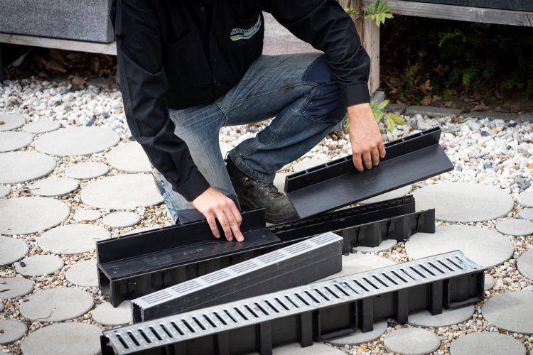 Om wateroverlast tegen te gaan legt Boesheide veel infiltratiekoffers aan in nieuwe tuinen. 'Hemelwater mag niet meer via het riool afgevoerd worden. Door een infiltratiekoffer in de grond te plaatsen, wordt het hemelwater verzameld en daarna infiltreert het na verloop van tijd weer in de bodem.' Een tank installeren om water te bufferen doet Beckers bijna niet. 'Wij infiltreren meestal omdat je om te bufferen moet werken met een pomp die ervoor zorgt dat het water weer omhoogkomt. Maar je hebt dan geen zicht op wanneer de tank vol is.' Een andere optie is rekening houden met de keuze van bestrating. 'We zijn nu veel bezig met Eco Solutions van Ebema, een nieuwe lijn van waterdoorlatende of -passerende bestratingsmogelijkheden. Ze hebben een ronde steen met daarin kiezels. Dit zijn best leuke oplossingen, maar het moet wel bij de rest van de tuin passen. We zeggen altijd dat bestrating mooi én functioneel moet zijn. Als je van A naar B moet rijden met een zitmaaier, kun je in plaats van dichte tegels ook grastegels leggen. Die zijn ook nog eens goedkoper, dus daarmee kunnen we klanten overtuigen.'