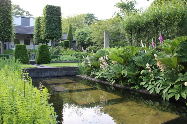 Van der Meijden maakt in zijn ontwerpen niet specifiek ruimte voor klimaatproblematiek. Toch komt het veel terug in zijn werk. 'We krijgen veel werk via architecten, waarbij wij vooraf kritisch naar het ontwerp kijken, met name naar de waterproblematiek. Waar andere hoveniers dan een afvoergootje plaatsen en aansluiten, proberen wij het net even anders te doen, zodat het water de kans krijgt om in de grond te zakken. Dat is de truc: vertragen.' Bij Van der Meijden thuis legt het water dan ook een zo lang mogelijke weg af door de tuin. Dat begint bij het platte groene dak. Het water dat over is als het groendak verzadigd is, loopt via een regenpijp naar de vijver. Dat waterpeil kan met een aantal centimeter verhoogd worden. Als het écht enorm regent, loopt het water via de achterkant van de vijver, die net iets lager is, de border in. 'Dit kan ook bij particuliere tuinen. We kunnen precies berekenen hoeveel water er van het dak af komt. Je moet alleen een leuke en nuttige manier vinden waarop de tuin het water kwijt kan of juist kan gebruiken. Maar je moet wel goed weten waar je mee bezig bent.'