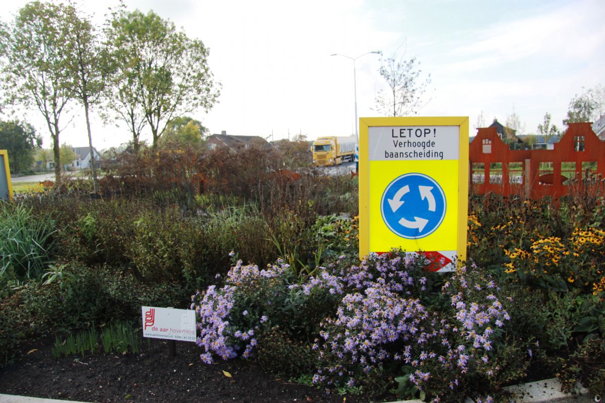 Al twaalf jaar onderhoudt De Aar Hoveniers de betreffende rotonde. 'De gemeente Woerden heeft groenbedrijven in de buurt gevraagd om een rotonde te sponsoren. Zo zijn ook wij gevraagd. Wij hebben de rotonde aangelegd en onderhouden deze op onze kosten; in ruil daarvoor mogen wij een bordje met "De Aar Hoveniers" op de rotonde zetten', legt Post Uiterweer uit. 'Vorig jaar ging de rotonde volledig op de schop: de eenbaansrotonde werd een zogenaamde turborotonde met meerdere rijbanen. De rotonde zelf bestond uit een dikke laag zand, dus we hebben eerst 40 centimeter uitgegraven en vervangen door de juiste grond.' De wegaannemer gaf Post Uiterweer tekeningen van de rotonde voor het ontwerp, maar toen hij een kijkje ging nemen, bleek de rotonde veel groter te zijn dan verwacht. 'Daarom hebben we op het laatste moment meer beplantingsvakken en een extra boom toegevoegd. Dat heeft goed uitgepakt, want alle vormen zijn mooi in balans. De beplanting is gelaagd; hij begint laag en eindigt hoog.' Eens in de twee weken wordt de rotonde in de vaste route van de onderhoudsploeg meegenomen. Veel onderhoud is er niet nodig, doordat de beplanting groeikrachtig is en bestand tegen extreem weer zoals veel zon en wind. Warmerdam: 'Daar hebben we rekening mee gehouden in het ontwerp. De kleurrijke mixborders bestaan uit heesters, vaste planten, siergrassen en bolgewassen. En met de kleur geel wordt een groot deel van het jaar een zonnige indruk gewekt. Een hoogstamboompje met een transparante kroon geeft wat extra hoogte aan het geheel. Een hoogstamboom belemmert het zicht over de rotonde niet.'