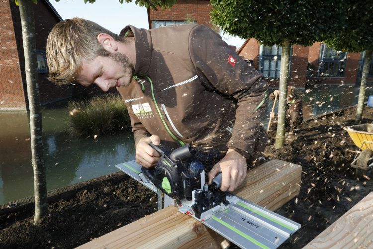 We spreken Den Engelse op locatie bij een klus in Beuningen. Hij legt daar een nieuwe tuin aan bij een mooi vrijstaand huis aan het water. De oude tuin is ten tijde van de bouw van het huis aangelegd; de bewoners willen nu wat anders. Den Engelse: 'Na verloop van tijd raak je uitgekeken of ga je de tuin anders gebruiken. Het huidige ontwerp sluit aan op de huidige wensen.' Direct aan het water stonden veel planten, waardoor je in de tuin een opgesloten gevoel had. Ook leek de tuin daardoor heel ondiep. Daar moest wat aan gedaan worden. 'De bewoners wilden weinig inkijk van de huizen aan de overkant van het water. Daarom hebben we de bomen laten staan en andere beplanting weggehaald; daar zijn siergrassen voor in de plaats gekomen. Het terras was in verhouding groot voor de tuin, dus dit wordt flink verkleind. Daar komen gras en beplanting voor in de plaats. Aan de zijkant van het huis gaan we een zwevende vlonder plaatsen. Aan de andere kant komen verhoogde, wit gestucte bloembakken.' Den Engelse heeft bij het ontwerp geluisterd naar de wensen van de klant. 'Ik kijk hoe dat past in het geheel en voeg er eventueel dingen aan toe. Dit is een supermooie klus, met alles erop en eraan: geautomatiseerde verlichting, beregening en een robotmaaier die via een app te bedienen zijn.'