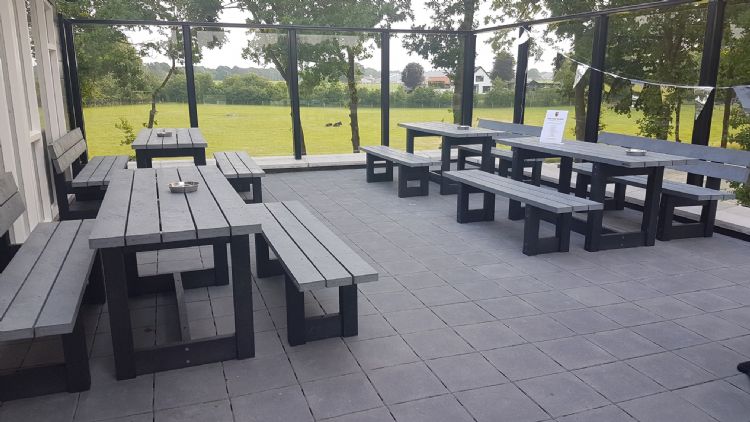 Het buitenmeubilair is van 100% gerecycled kunststof en heeft een garantie van 10 jaar. Zoals gezegd, het ideale terras. Banken, tafels, plantenbakken, sta-tafels, noem maar op. Het duurzame meubilair van hoogwaardig kunststof is in verschillende kleuren en designs beschikbaar. Zo kunt u kiezen uit de kleuren grijs, zwart, bruin, beige, en groen. Hierdoor zijn er vele leuke combinaties mogelijk en zo voor iedere club de juiste uitstraling.