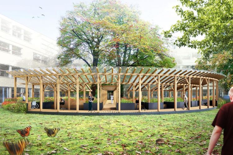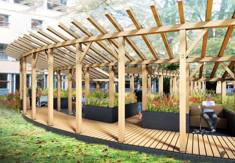 Vanaf de afdeling oncologie leidt een steiger naar buiten waar in een besloten tuin onder twee grote bomen een paviljoen staat met zeven comfortabele behandelstoelen. Bij het plaatsen van de stoelen is rekening gehouden met de omgeving. Patiënten worden omgeven door planten en bloemen, er is een afdak dat beschermt tegen zon en regen en in een aantal pilaren zitten vogelhuisjes en vlinderhotels.