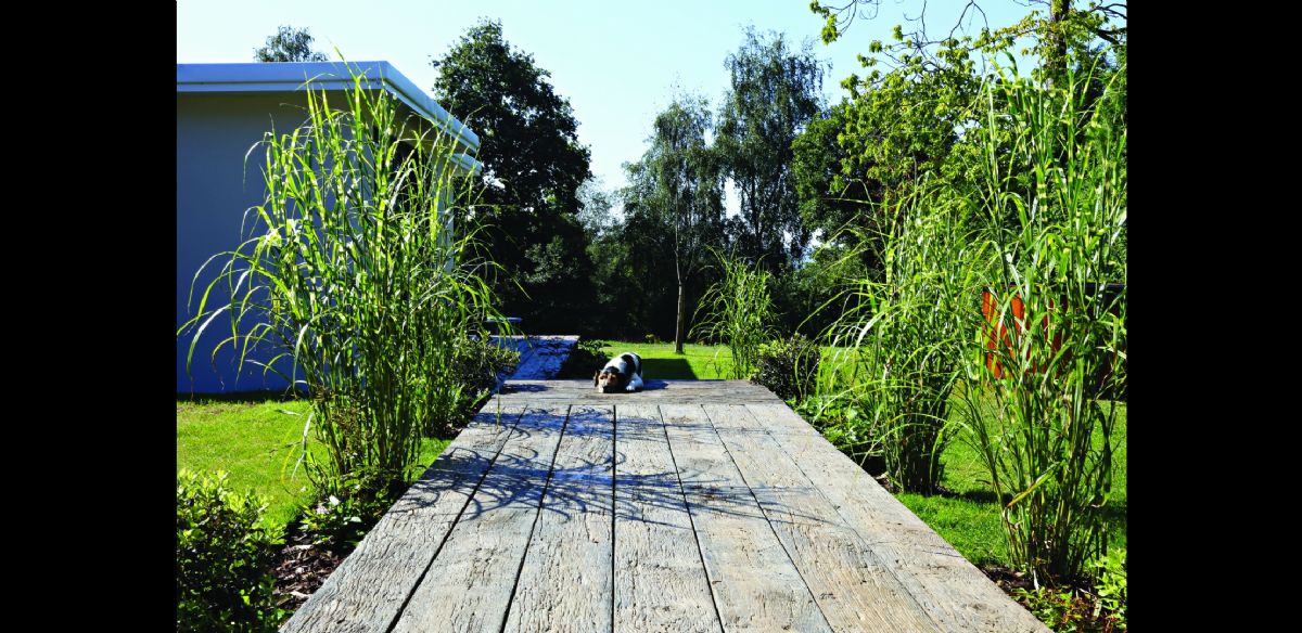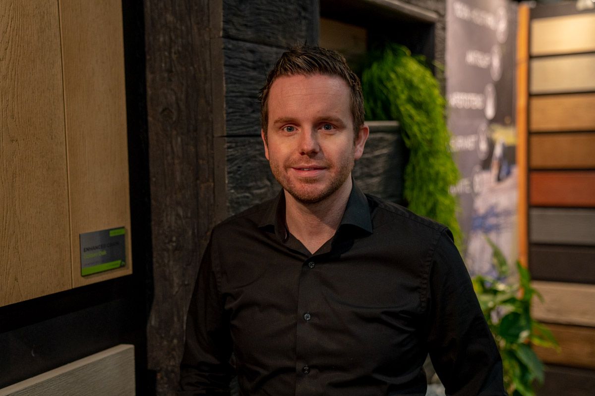 Patrick Smidt is met zijn bedrijf Alterwood de officiële distributeur van het Engelse product Millboard. Millboard-planken zijn kunststof dekplanken voor het terras buiten. De bedrijfsnaam zegt het al: hij wil een alternatief voor hout bieden, maar dan wel met de look van hout. 'We pretenderen de meest natuurgetrouwe kunststof plank ter wereld te hebben', zegt Smidt gloedvol. 'Het is een combinatie van het uiterlijk en de nabewerking van de plank: hij wordt als vloeibaar mengsel gegoten in een mal van een echte eiken plank en hardt daarna uit. Het is dus een een-op-eenkopie tot in de details van de houtnerven. De basiskleur is bruin, maar hij kan ook grijs of zwart zijn. Met de hand worden uv-bestendige kleurschakeringen in de houtnerven toegevoegd. Bij lichte planken zijn dit donkere kleurschakeringen, bij donkere planken lichte kleurschakeringen. Hierdoor komen de houtnerven nog beter tot uiting, zoals dat bij een echte plank ook het geval is.'