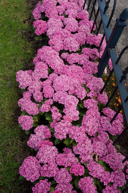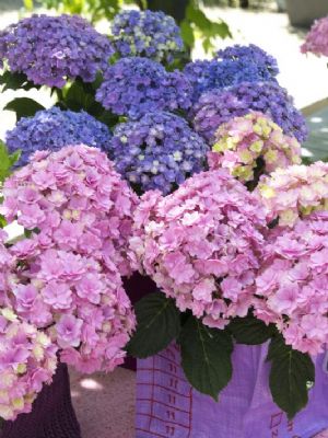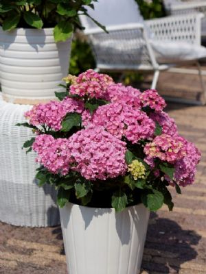 JapanGezien de overdaad aan nieuwe cultivars die ontwikkeld worden in Europa en de Verenigde Staten, zou je bijna aan het feit voorbijgaan dat H. macrophylla van nature voorkomt in Japan. In de natuur is het trouwens niet eens een heel algemene plant; H. Macrophylla komt maar in een relatief klein deel van Japan voor. In het (verre) verleden zijn diverse zeer goede en nog steeds bekende cultivars uit Japan gekomen; denk bijvoorbeeld aan 'Ayesha' en 'Otaksa'. Maar dit zijn cultivars uit de 19e eeuw. Is er daarna dan niets meer gebeurd in Japan? Jazeker, maar door het vele veredelingswerk in onze streken en de commercie die deze planten steeds promootte, zijn de Japanse cultivars bij ons vrijwel onbekend gebleven. En natuurlijk kwam er af en toe een spectaculaire cultivar uit het verre oosten, zoals 'Hanabi', maar met de YOU&ME-serie is daar definitief verandering in gekomen.YOU&ME TOGETHERVoor een hortensia wordt YOU&ME TOGETHER ('Youmefive') niet hoog. De plant groeit compact; hij wordt uiteindelijk ruim 1 m hoog en iets breder. De stevige twijgen zorgen ervoor dat de planten niet openvallen, wat bij andere, met name 'dubbelbloemige' hortensia's nog weleens het geval is. Net als de twijgen voelen ook de donkergroene bladeren stevig aan. Ze zorgen mede voor de gezonde uitstraling van de plant, ook als deze niet bloeit. Zoals bij vrijwel iedere hortensia vormen de bloemen de belangrijkste sierwaarde. Bij YOU&ME TOGETHER verschijnen deze in brede, afgeplat bolvormige tuilen. Het unieke aan de bloemen valt direct op: YOU&ME TOGETHER heeft 'dubbele' steriele bloemen. Iedere afzonderlijke steriele bloem heeft twee tot drie kransen van dieproze bloemblaadjes. Bij uitbloeien kleuren ze bleek lilaroze. Hoewel dit niet aantrekkelijk klinkt, is het dat juist wel. De combinatie van verse dieproze bloemen en iets oudere lilaroze bloemen geeft YOU&ME TOGETHER juist een wat informeel karakter. Uiteindelijk zullen de steriele bloemen rood kleuren en deze kleur behouden tot ver in oktober, soms tot begin november.YOU&ME TOGETHER is onderdeel van een serie van origine Japanse hortensia's die als YOU&ME-serie op de markt zijn. Andere rassen in deze serie zijn You&Me Forever ('RIE01', lichtpaars), YOU&ME MISS SAORI ('H2002', wit met paarsrood gerande bloemen), YOU&ME PERFECTION ('Perfrie', helderroze) en YOU&ME ROMANCE ('RIE09', zachtroze). ToepassingYOU&ME TOGETHER is prima winterhard en kan zeer goed in (kleinere) tuinen en parken worden toegepast. Vooral in kleine groepen, in combinatie met andere Hydrangea macrophylla- of paniculata-cultivars, kan het effect prachtig zijn. Ook combinaties met zomer- of herfstbloeiende vaste planten (bijvoorbeeld herfstanemonen) zijn aan te bevelen. Ten slotte is 'Youmefive' ook aantrekkelijk als potplant.YOU&ME TOGETHER groeit prima op iedere voedzame, goed doorlatende bodem. Zoals iedere hortensia zal de plant alleen goed op kleigrond groeien nadat er bodemverbetering heeft plaatsgevonden. Op schrale (zand)gronden moet gezorgd worden dat de planten 's zomers niet uitdrogen. YOU&ME TOGETHER wordt exclusief op de markt gebracht door Plantipp BV uit IJsselstein. Kwekers over Hydrangea You&Me Together'Deze soort heeft drie voordelen', zegt Ard van Klaveren van Van Klaveren Plant BV. 'Ten eerste heeft Hydrangea Together een lange bloeitijd. De bloemen kleuren lange tijd door tot herfsttinten en de groei is compact. Het is ook minder noodzakelijk om de soort te snoeien.''Het is zeker een toevoeging', zegt Van Klaveren desgevraagd. 'Ook vanwege de groei. Veel boerenhortensia's worden lang en groot. Een flinke terugsnoei is dan noodzakelijk. Deze blijft compact met een prachtig bladpakket. Glanzend donkere bladeren vormen een mooi contrast met de roze of blauwe bloemen, afhankelijk van de pH.' Met de afname gaat het goed, volgens Van Klaveren. 'Maar deze soort wordt niet afgenomen vanwege de bloemkleur, maar vanwege het groei- en bloeigedrag', legt hij uit. 'Consumenten en hoveniers herkennen dit ras en komen regelmatig terug om nog eens te bestellen. In onze voorraad staan zo'n vijfduizend planten die op dit moment te koop worden aangeboden aan hoveniers en exporteurs', zegt Van Klaveren. 'De komende maanden zullen deze planten een bestemming vinden. Deze soort is zowel binnen als buiten te telen. Bij Hydrangea Together is de bloei zeker en hij blijft mooi compact groeien, zodat er nauwelijks remmiddelen nodig zijn. Het stevige blad zorgt ervoor dat plagen niet snel in het gewas doordringen. De sterke wortels zijn bestand tegen het eventueel blauw maken van de bloemen.' 'Deze soort heeft heel mooie bloemknoppen; ze vriezen ook niet zo snel af', zegt Sebastiaan Hoogenraad van de gelijknamige kwekerij uit Ederveen (Gelderland). 'Daarnaast is het fijn dat deze soort altijd doorbloeit, het hele jaar door. Het is ook een dubbele bloem. Als je wat breder kijkt, hebben steeds meer soorten dit soort kenmerken.' Kwekerij Hoogenraad had zo'n veertigduizend exemplaren van Hydrangea Together staan. 'Die zijn allemaal weg', zegt Hoogenraad. 'Je kunt dus wel stellen dat de soort populair is en het goed doet.' 'Verder is Hydrangea makkelijk te kweken', gaat Hoogenraad verder. 'Er komen geen noemenswaardige problemen bij kijken. Deze heeft wel een groot voordeel ten opzichte van andere soorten. Als je die op een verkeerd moment knipt, heb je de rest van het jaar geen bloemen meer. Bij deze is dat niet zo; dat kan op elk moment en dat is heel fijn. Verder is de soort wel vatbaar voor bijvoorbeeld schimmel, maar niet meer of minder dan andere.' 'Volgend seizoen gaan we zeker verder met Hydrangea Together', zegt Hoogenraad. 'Wel in dezelfde aantallen als voorheen. Wij zijn er blij mee; het is echt een toevoeging.'