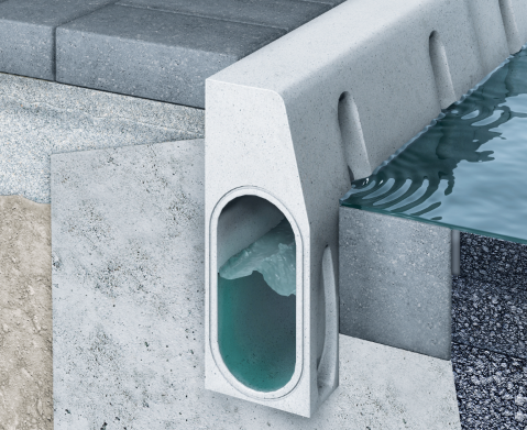Hevige regenbuien zijn van invloed op de verkeersveiligheid. Daarom is voor een snelle afwatering van bijvoorbeeld rotondes de ACO Kerbdrain ontwikkeld: een afwateringssysteem en trottoirband in één. Dankzij de inlaatopeningen aan de zijkant is de inlaatcapaciteit groter dan bij het gebruik van kolken en hoeft het toestromende water geen lange weg af te leggen. De Kerbdrain is ook in de extra duurzame variant Vienite leverbaar. Vienite is een nieuw op polymeer gebaseerd materiaal dat gerecycled glas bevat. Vienite voldoet eveneens aan alle eisen qua hoogwaardige buig- en druksterkte en is, net als polymeerbeton, recyclebaar.