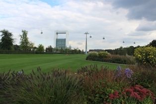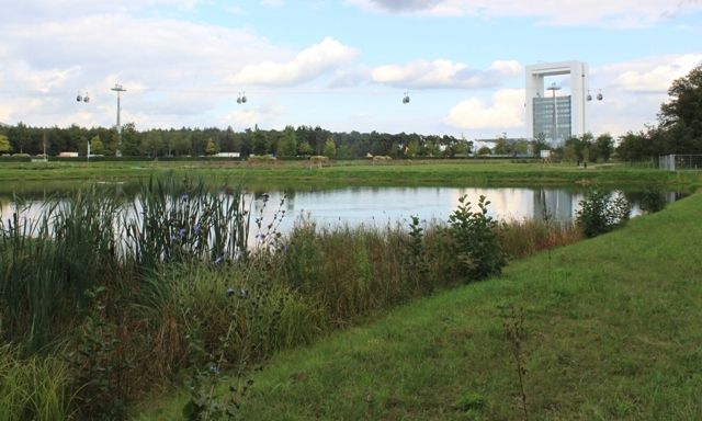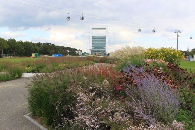 Zicht op de kabelbaan en de 70 meter hoge Innovatoren.