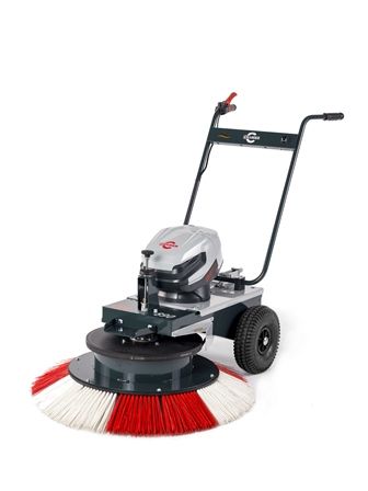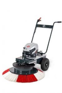 Cramer KMR89-veegmachine. Vermogen 1,5 kW, gewicht 64 kg, werkbreedte 89 cm, 1 uur continue autonomie op twee accu´s, kan links- en rechtsom draaien