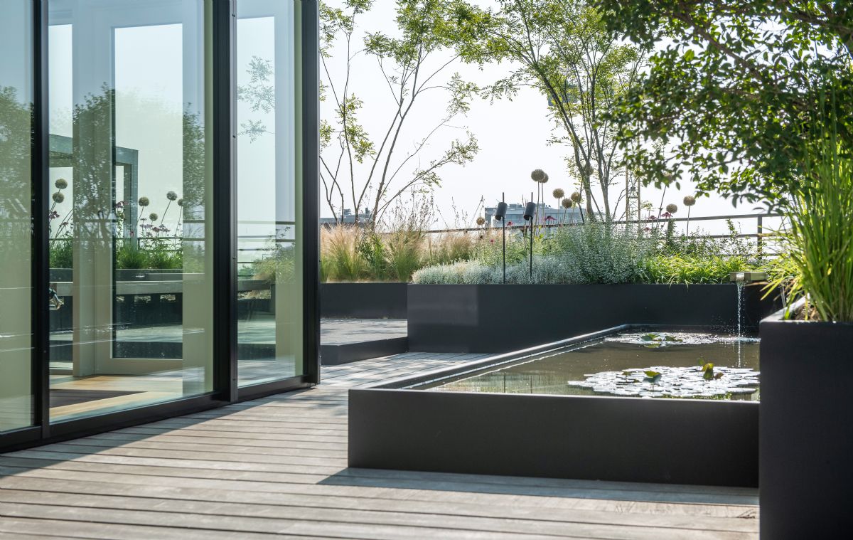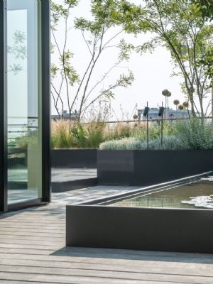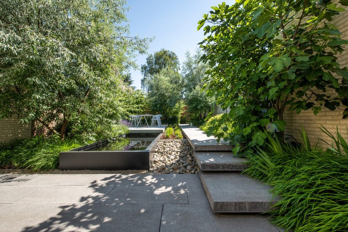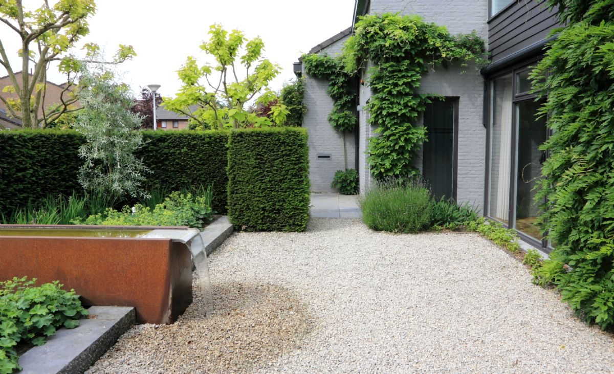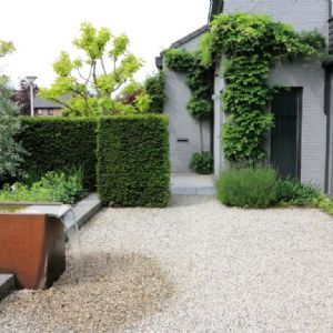SamenwerkingToen Puur startte, deden de compagnons het werk naast het ontwerp en de aanleg van tuinen nog voor driekwart zelf. In de loop der jaren groeide het team. Naast meer hoveniers en ontwerpers kwamen er ook mensen bij op kantoor voor de administratie, facturatie en calculatie.Hagenbeek en Nickmans zorgen ieder op de eigen locatie voor de intake, de planning en de verkoop. 'Iedereen binnen het bedrijf heeft zijn eigen verantwoordelijkheid. We zijn gezegend met fijn en betrokken personeel. Dankzij ons volume kunnen we ons dit veroorloven en kunnen we grotere projecten aan.' In de uitvoering zoekt Hagenbeek samenwerking. 'Je kunt niet alles zelf doen. Wij besteden gespecialiseerde werkzaamheden uit aan een vaste schil van bedrijven waar we mee samenwerken. Je moet ons in dat opzicht meer zien als hoofdaannemer. De aanleg van een zwembad, bijvoorbeeld, besteden we uit aan een zwembadbouwer. We hebben contact met een aantal zwembadbouwers waar we achter staan als het gaat om kwaliteit en werkwijze. Iets dergelijks geldt ook voor bouwwerken, houtwerken als omheiningen en vlonders, elektriciteit, beregening, aanleg van hekken en poorten enzovoort.' Duurzaam denkenOm een idee te geven van het type tuinen, laat Hagenbeek op zijn computer een selectie van door Puur aangelegde tuinen zien. Het zijn echte designtuinen: eenvoudig, met duidelijke lijnen en bijzondere materialen. Je ziet er bijvoorbeeld een vijverrand terug van antieke Antwerpse kadestenen, waterelementen van Belgisch hardsteen, kinderkopjes, gebakken klinkers en verschillende vormen van natuurstenen.Duurzaamheid is een randvoorwaarde. 'In ons onderbewustzijn zijn we bezig met de opwarming van de aarde. Maar bij ons vind je geen grote borders met vlinderbloemigen die bijen en andere insecten trekken. Je ziet ook geen insectenhotels. We zullen nooit een geitenwollensokkentuin aanleggen', lacht Hagenbeek. Wél vindt hij dat de tuin qua materiaalkeuze duurzaam moet zijn. 'Zo'n tuin moet over twintig jaar nog steeds heel mooi zijn. Gebruik duurzame materialen bij de aanleg en denk goed na over de beplanting. We kiezen voor een rustige beplanting die past bij de leefomgeving. Als je een boom in de tuin zet, is hij voor het nageslacht. Dat betekent dat je er goed over moet nadenken. Er is maar een beperkt aantal soorten bomen geschikt voor de stadstuin', geeft hij als overweging mee. Het is ook belangrijk om rekening te houden met de juiste standplaats van planten en de ziektegevoeligheid. Buxus is een bekend voorbeeld, maar is het bij iedereen bekend dat een aantal bodembedekkers en vaste planten schimmelgevoelig zijn? Pachysandra is bijvoorbeeld behoorlijk schimmelgevoelig en een aantal geraniumsoorten kwijnt weg. Plantenkennis vindt Hagenbeek daarom erg belangrijk. Zelf komt hij nog uit de tijd dat dit vak meer aandacht kreeg dan nu. Hij heeft aan het begin van zijn werkzame leven heel wat beplantingsplannen gemaakt.