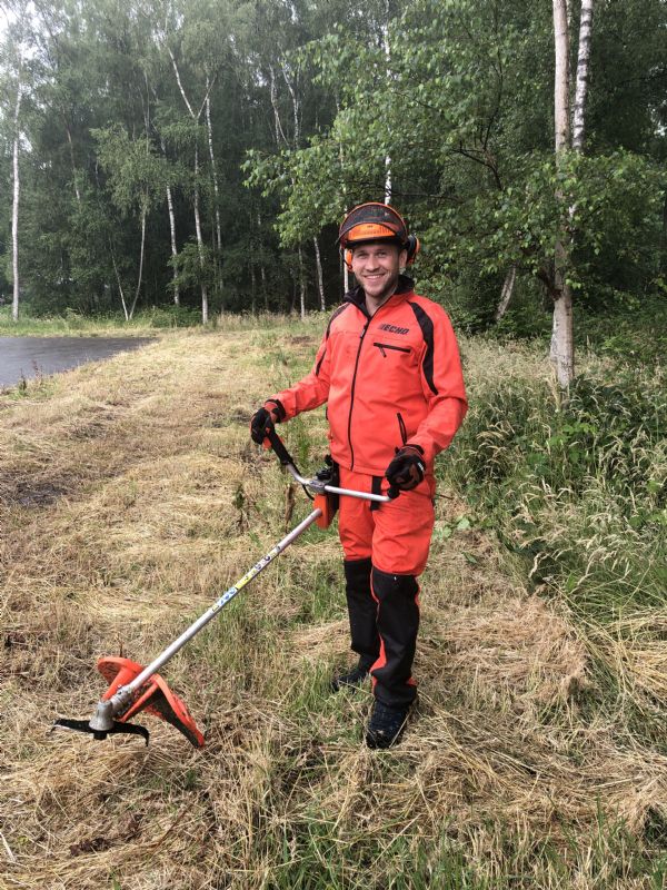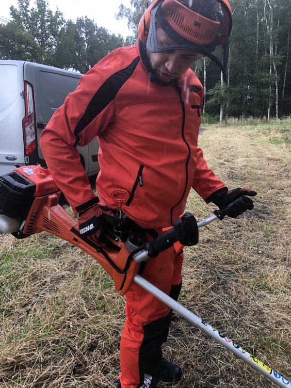 'Deze machine heeft een 52 cc motor; dat is de zwaarste die wij hebben in het bosmaaiersegment', vertelt Maes. 'Behalve met de veiligheidsrichtlijnen waar iedere machine aan moet voldoen, hangt een groot deel van de veiligheid samen met de ergonomie en het gebruik. We dragen het Echo-harnas onder ons jasje, zodat onze visibility volledig blijft. Dat is belangrijk wanneer je langs de weg werkt. De gewichtsverdeling over het lichaam moet zo zijn dat 80 procent op de heup rust en 20 procent op de schouders. Op oneffen terrein werk je dan nog steeds veilig. Ook word je zo minder snel moe. Je moet even de tijd nemen om het harnas goed in te stellen. Omdat het gewicht van een bosmaaier opzij hangt, heeft het harnas een borstband waardoor het gewicht goed verdeeld wordt en er zo min mogelijk stress op het lijf ontstaat. Dankzij Easy Start, waarmee elke machine is uitgerust, kun je de maaier eenvoudig aantrekken terwijl hij op je rug hangt. Je hoeft niet, wat je bij andere merken weleens ziet, de machine tussen je benen door te halen of zoiets. Het harnas is uitgerust met een ergonomisch draagtuig. Er zit een haak op waarmee je met één haal de bosmaaier loskoppelt, waardoor deze op de grond valt. Het is namelijk verplicht dat je de bosmaaier in één beweging van je af moet kunnen smijten in geval van nood.'