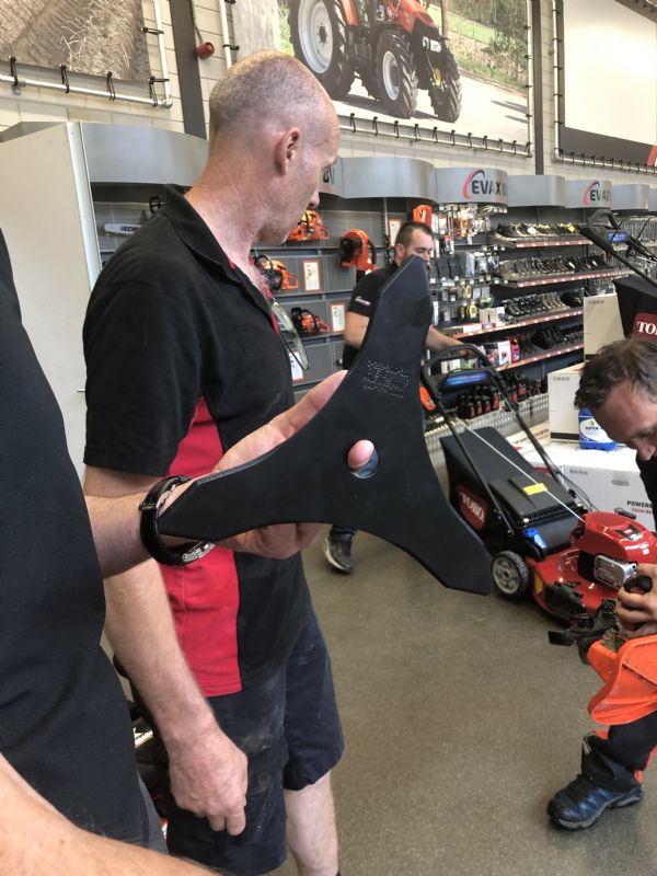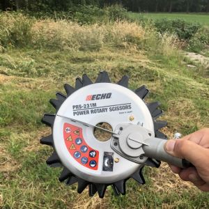 Johan Teeuwen is productmanager bij Eurogarden en vertegenwoordigt de Yamabiko-labels Echo en Shindaiwa. Jan Maes is technical support engineer bij Yamabiko in België. Teeuwen: 'Deze bosmaaier onderscheidt zich van degene die er al zijn. Allereerst door het vermogen; het is de zwaarste bosmaaier die we hebben. Daarnaast kun je er meer werktuigen op monteren dan mensen vaak in de gaten hebben. Standaard wordt de bosmaaier BCLS-520ES geleverd met een hakselmes met beschermkap. Door de vorm van het mes kun je er hakselwerkzaamheden mee doen. Je kunt er grof onkruid mee wegwerken, maar bijvoorbeeld ook bramenstruiken en zaailingen. Het maaien met deze machine werkt ook anders. Je maakt een verticale beweging op en neer en op die manier verpulvert de machine datgene wat je wilt verkleinen. Dit is een iets andere maaitechniek. Je ziet dat deze bosmaaier is uitgerust met een grotere beschermkap. Dat is ook nodig: vanwege de verticale beweging en het vermogen kan er veel meer materiaal vrijkomen.'