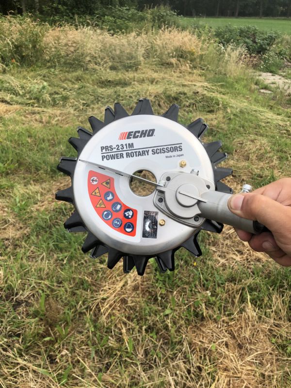 De bosmaaier van Echo raast met hakselmes door grof groen