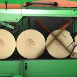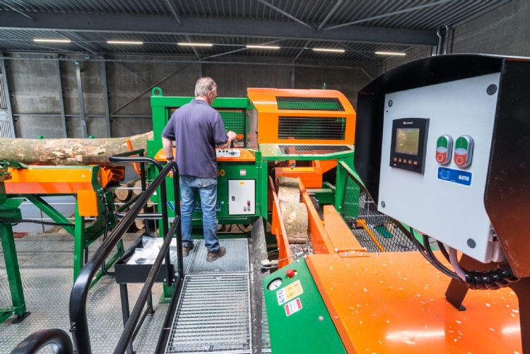 Posch importeur Stierman De Leeuw heeft de hele installatie in Almere verzorgt. Accountmanager Frans Stiekema geeft een toelichting. 'De machine is geschikt voor stammen met een maximale lengte van 5 meter en diameter van 65 cm. Bij voldoende toevoer kan deze machine met gemak 25 m3 aan haardhout per uur produceren.' Zodra er een houtstam op de hydraulische invoerrol wordt geplaatst kan de machine zijn werk doen. En om de machine aan te sturen hoef je alleen een joystick te gebruiken. Met de joystick zorg je dat de stam wordt getransporteerd naar de zaagunit. Deze unit beschikt over een 90 cm Harvester kettingzaagblad waardoor stamdiameters van 65 cm geen probleem zijn voor deze machine. In de zaagunit wordt de stam in kleinere stamschijven gezaagd. Via de transportband gaan de schijven vervolgens naar de kloofunit. De optische sensor boven de transportband registreert of er hout aanwezig is en zorgt vervolgens dat het kloofproces automatisch wordt gestart. Ook zorgt deze zelfde sensor ervoor dat het proces automatisch wordt stilgezet wanneer er een geen hout meer op de toevoer ligt.