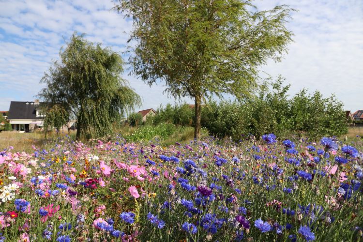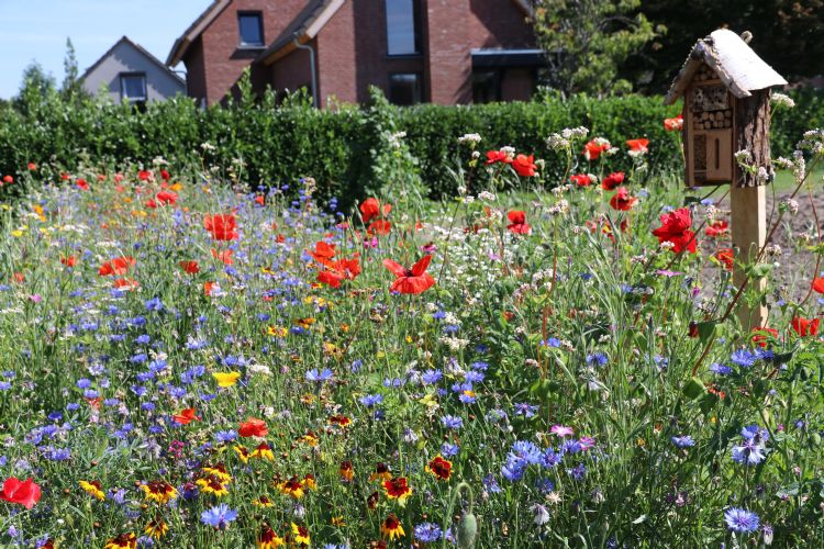 | | Afbeelding: Bij deze prachtig bloeiende strook met het mengsel Binnen de Bebouwde Kom is een klein insectenhotel neergezet. |