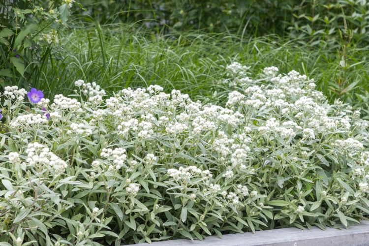 Anaphalis triplinervisStandplaats: zonWinterhardheid: goed Hoogte: 30 - 40 cm Bloeitijd: juli, augustus, september Bodem: vrij schrale droge tuingrond Omschrijving: Deze Siberische edelweiss kan best wat droogte hebben en bloeit vanaf juli met mooie witte wolken. Het is een niet-veeleisende vaste plant, die het ook goed doet als bodembedekker. De plant heeft langwerpige groengrijze bladeren, die aan de onderzijde wollig behaard zijn. De plant zorgt voor een mooi grijs accent in de tuin. De plant kan goed tegen zeewind.
