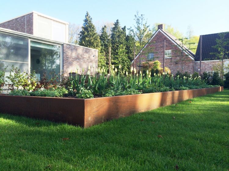 Volgens Van Hooff is rust in de tuin een terugkerend thema. 'Bij een wilde beplanting is het goed als de toegevoegde producten zoals meubels en plantenbakken ondergeschikt en rustig zijn. Dat creëer je onder andere door enkele grote stukken te plaatsen, liefst van hetzelfde materiaal. Zo zijn er mensen die onze meubels zowel binnen als buiten gebruiken of één mooi groot item aanschaffen. Doordat we alles op maat kunnen maken, dragen wij bij aan die rustige inrichting. Stel, je hebt een balkon van 3,5 meter en je wilt een plantenbak. Dan kun je een aantal kleinere nemen, maar vaak past het net niet en oogt het rommelig. Bij ons kan de hovenier een balkonbak bestellen van 3,5 meter in de gewenste kleur en hoogte en zo evenwicht en rust creëren op het balkon.' Hij vertelt verder: 'We hebben eens een vijver van 70 meter gemaakt, opgedeeld door kleine aluminium panelen die onzichtbaar aan elkaar verbonden waren. De hovenier had het bedacht. Hoveniers kunnen hun toegevoegde waarde laten zien met hun creativiteit. Je begrijpt, de hovenier is voor ons heilig!'