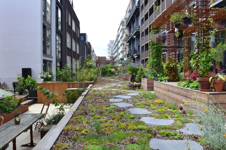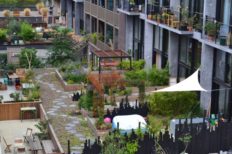Daken in Houthavens omgetoverd tot daktuinenAan de Haparandaweg in de populaire wijk Houthavens in Amsterdam zijn vijf zwarte daken tegelijk omgetoverd tot een groene oase in het stedelijke gebied. Daarbij hadden de verschillende bewoners ieder hun eigen wensen, maar ontstond er toch een mooi geheel.'Standaard waren de daken opgeleverd met tegels. Vijf buren kwamen bij ons met de wens: we willen ieder een eigen tuin met een gezamenlijk achterom', vertelt Marc Heemskerk, hoofd uitvoering bij De Dakdokters, een full-service hoveniersbedrijf dat uitsluitend gericht is op de aanleg van groene daken, daktuinen, dakterrassen en dakparken. Omdat het om nieuwbouw ging, waren de constructieve gegevens van de daken bekend. Dat is anders bij bestaande gebouwen. De Dakdokters huren dan iemand in om constructieve berekeningen te maken op basis van de gegevens die zij zelf aanleveren, bijvoorbeeld door insnedes te maken om de balklaag van een dak in beeld te brengen. Ontwerp'We hebben de wensen van de individuele bewoners verzameld en op basis daarvan zijn onze ontwerpers aan de slag gegaan', vertelt Heemskerk verder. Voor de aanleg van groene tuinen en verschillende daktuinen werken De Dakdokters met systemen van Optigrün Benelux. Ze gebruiken FKD25 voor extensieve daken met sedum. FKD40 is heel geschikt voor daktuinen. Er is een hogere drainagecapaciteit en 20 tot 30 cm substraat, waarop vaste planten kunnen groeien. Het WRB85i-systeem met waterretentiekratten en 60 liter/m2 wateropslag wordt door De Dakdokters gebruikt voor de zogenaamde polderdaken, die regenbuien tijdelijk kunnen opvangen zodat het riool niet overbelast raakt.In het geval van de particuliere daktuinen in De Houthavens is FKD40 gebruikt voor de tuinen zelf en FKD25 voor het sedumgedeelte met looptegels in het gezamenlijke achterom.