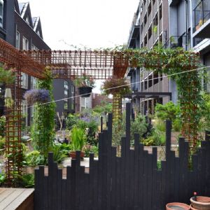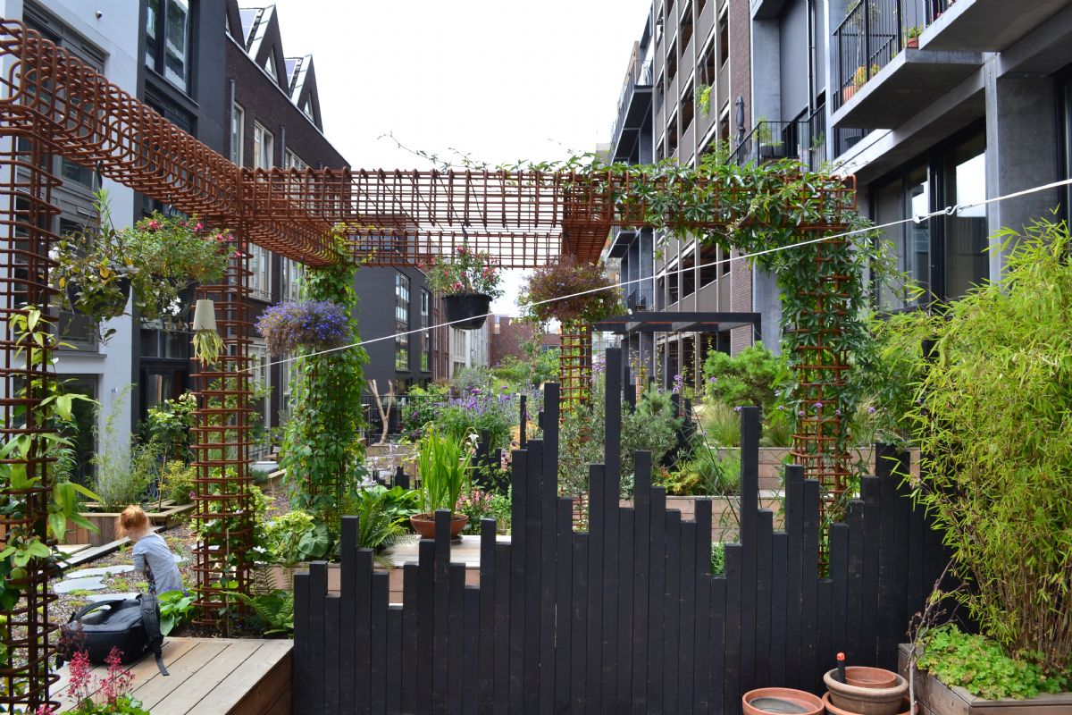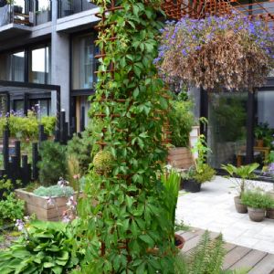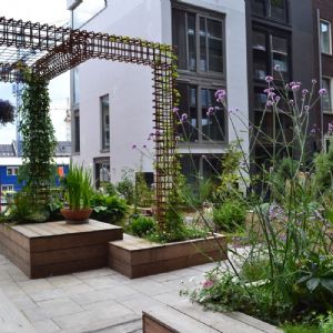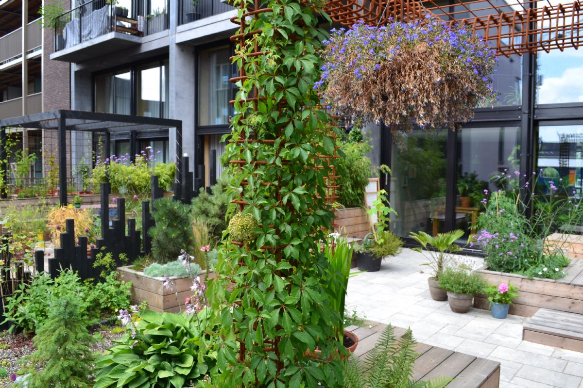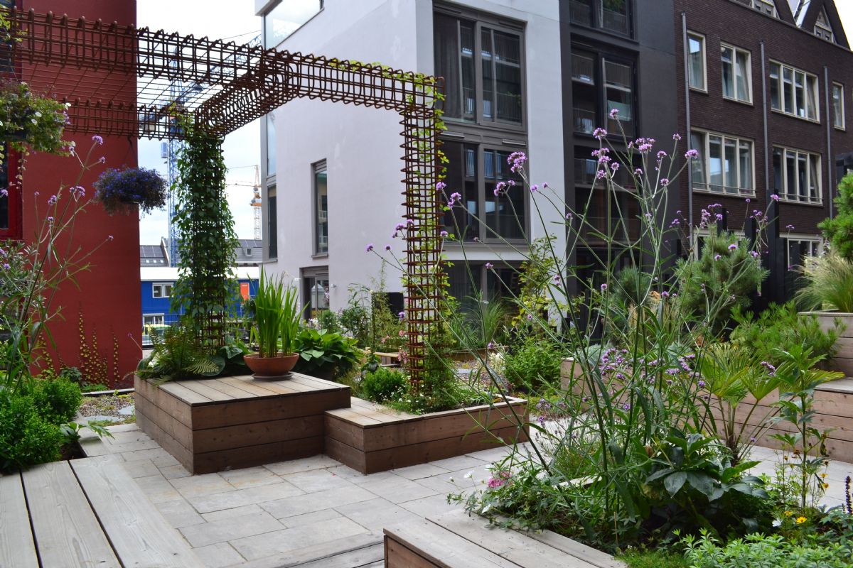 Bijzondere elementenHeemskerk: 'De grootste beperking bij de plantenkeuze is de hoeveelheid substraat. Je hebt hier geen oneindige grondbuffer. Vaste planten doen het wel in een substraatlaag van 20 tot 30 cm. Dat geldt minder voor heesters. Voor hogere bakken heb je meer draagkracht nodig. Je kunt wel hogere bakken maken op een dak, maar je mag ze niet volstoppen met substraat in verband met de draagkracht van het dak. We maken regelmatig bakken van 90 cm hoog, maar vullen dan alleen de bovenste 20 cm met substraat. Als we toch heesters willen gebruiken, zoeken we naar de kolommen en draagmuren in een dak. Hierop mag vaak meer gewicht toegepast worden.'Hij vervolgt: 'Een andere manier om toch hoogteverschillen in beplanting te creëren, is werken met klimmers. Hier hebben we gewerkt met een grote pergola van bouwstaal met groenblijvende klimmers. We hebben wandjes gemaakt van zwarte houten palen. Alle vaste inrichtingselementen zoals meubels en plantenbakken hebben we zelf gemaakt.' De tuinen zoals ze op de foto's staan, zijn ongeveer een jaar oud. Andere projectenDe naam 'De Dakdokters' is niet zomaar uit de lucht gegrepen. De missie van dit bijzondere hoveniersbedrijf is steden 'gezond' maken. 'We willen zwarte daken weer groen maken, planten neerzetten die bijen en vlinders aantrekken, het aantal hitte-eilanden verminderen en met behulp van waterretentiedaken water langer vasthouden om de riolering te ontlasten', somt Heemskerk op.'Dit geldt voor iedere stad. De Dakdokters zijn de afgelopen tien jaar gegroeid van een klein bedrijf met particuliere klanten naar een full-service bedrijf dat daktuinen en -parken ontwerpt voor de particuliere en de zakelijke markt, met ongeveer vijftien man vast in de buitendienst. In totaal heeft het bedrijf 27 man personeel met kennis van tuinaanleg en beplanting, bouw en dakbedekkingen. Daarnaast huren wij dagelijks extra zzp'ers in om buiten al het werk rond te krijgen. De Groenmarkt in Amsterdam is een voorbeeld van een mooi zakelijk project dat nu in aanbouw is en naar verwachting eind dit jaar opgeleverd zal worden. Hier hebben we een heel duinlandschap met zoutwaterzwembad gerealiseerd.'