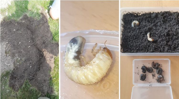 | | De secundaire schade aan het gazon (links) door aanwezigheid engerlingen (midden) en het effect van aaltjes op engerlingen (rechts). |