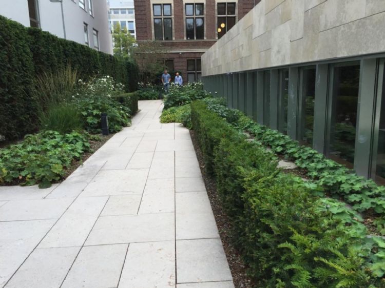 'De tuin bestaat uit drie groene elementen: blokhagen, solitairheesters en vaste planten,' vertelt Noome. 'Met Taxus-hagen zijn kamers gecreëerd om de tuin, die langgerekt is van vorm, te onderbreken. De kamers vallen met name te ervaren als er stoeltjes worden geplaatst en men daarop gaat zitten. De opbouwhoogte en het maximale toegestane gewicht waren namelijk niet extreem hoog: het totale bouwpakket - materialen en beplanting - mocht waterverzadigd niet meer dan 450 kg per m2 zijn. Binnen deze bandbreedte konden we 25 cm substraatlaag opbouwen en blokhagen plaatsen van niet hoger dan een halve meter. Als je door de daktuin loopt, kun je de hele tuin overzien.'