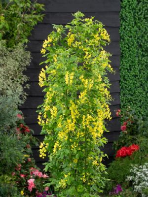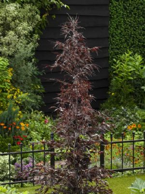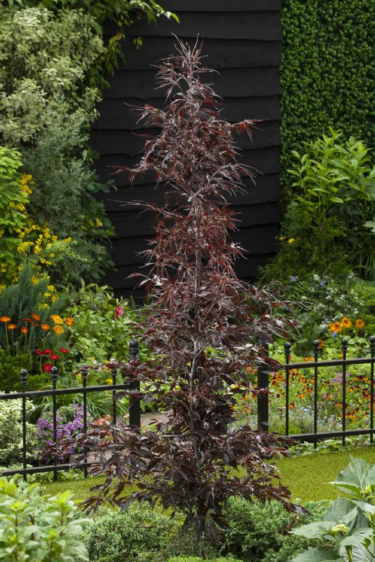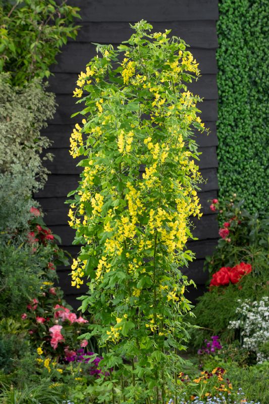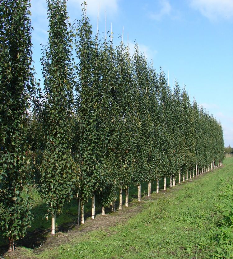 Betula pendula Fastigiata Joes ('Jolep1') PBR'Fastigiata Joes' is een zeer gezonde zuilberk met een strak opgaande groei en een zeer mooie witte bast, die al na drie jaar zichtbaar is. De volwassen boom wordt 7 meter hoog. Deze eigenschappen maken de boom goed toepasbaar in een kleinere tuin en als laanboom. De oranjegele herfstkleur geeft nog een extra dimensie aan het ras. 'Fastigiata Joes' is niet gevoelig voor ziektes en zeer winterhard.De veredelaar is John de Lepper uit Hulsel. De boom is in Europa beschermd onder nummer EU46991. In Nederland wordt de boom gekweekt door L. Akkermans Boomkwekerij, Boomkwekerij John de Lepper en A & E Maaijen VOF. Laburnum anagyroides LAYR (Yellow Rocket) EU20180789De goudenregen 'Yellow Rocket' is een strak opgaande zuilboom, die sierlijk en strak omhoog groeit zonder afhangende takken. De boom wordt ongeveer 5 meter hoog. De kroon bovenin blijft ook goed bij elkaar en zakt niet uit na enkele jaren. Om een zo mooi mogelijke bloei te krijgen, raden wij aan om zoveel mogelijk takken op de kroon te behouden; dit om het effect van de bloemen te versterken.Bloei, blad en tak De jonge twijgen zijn opvallend groen. Oude takken en de stam kleuren bruingroen. De stam blijft glad. Het donkergroene blad is drietallig; elk deelblad is 3 tot 8 cm lang en heeft een blauwgroene onderzijde. De bloei is uitbundig en begint in april/mei, met goudgele hangende trossen van 10-20 (25) cm lengte, maar de bloemen geuren niet. De peulen, bladeren en jonge twijgen zijn zacht behaard. Hierdoor verschilt deze goudenregen sterk van andere soorten. Snoei 'Yellow Rocket' bloeit op tweejarige takken. Om ieder jaar een mooie egale bloei te krijgen, raden wij dus aan om de lange doorschieters eruit te snoeien en de boom niet in zijn geheel terug te snoeien. Standplaats 'Yellow Rocket' verdraagt een kalkrijke grond. De boom is zeer winterhard en verdraagt temperaturen van -23° tot -28°C. De veredelaar is Csaba Kiss uit Hongarije. In Nederland wordt de boom gekweekt door A & E Maaijen VOF, Batouwe Boomkwekerijen BV, Boomkwekerij John de Lepper en P.W. Captein & Zn. Fagus sylvatica verschuurfag1 (Midnight Feather) EU20201298'Midnight Feather' is een opgaande beuk, die een mooie doorgaande tak maakt en goed dikt op de stam. Het is een gezonde boom die uitstekend te gebruiken is voor de kleinere tuin, het openbaar groen, als vakbeplanting of als boom langs de weg. Door de slanke vorm heeft 'Midnight Feather' nagenoeg geen snoei nodig. Knip alleen de wat langere takken weg om de mooie slanke vorm te behouden. Alleen uitdunnen is raadzaam.Nachtzwarte bladeren Het blad van 'Midnight Feather' is diep ingesneden en heeft de vorm van een hand. Zodra deze beuk begint te groeien, loopt hij uit met dieprode bladeren die gedurende het groeiseizoen verkleuren naar zwart, de kleur van de nacht. Deze mysterieuze kleur steekt heel mooi af in borders met planten met witte bloemen. Standplaats 'Midnight Feather' stelt weinig eisen aan de grondsoort. De boom is winterhard. Temperaturen van -25°C zijn geen probleem. Bladverbranding komt nagenoeg niet voor. Fagus sylvatica verschuurfag1 (Midnight Feather) is gevonden door Peter en Rianne Verschuuren. In Nederland worden de bomen gekweekt door A & E Maaijen VOF.