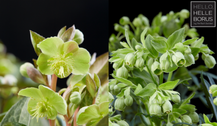 | | H. foetidus, (Rechts) ook wel stinkend nieskruid genoemd, bloeit van december tot maart. Links: Helleborus lividus Lilac Marble |