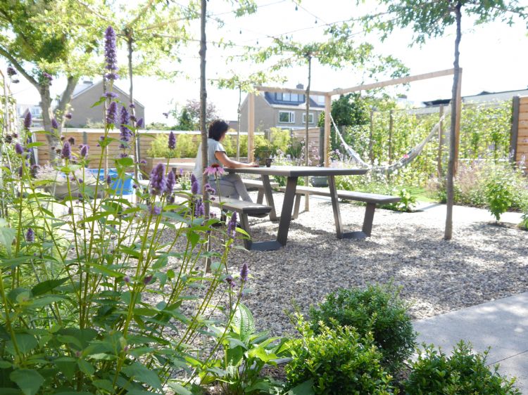 'Dankzij een ruim terras met grind, dakbomen en een grote picknicktafel kan er met het hele gezin gezellig samen buiten in de schaduw gegeten worden. Op het terras met loungemeubelen kun je van de ochtendzon genieten. De tuin bestaat uit twee niveaus; robuuste betonnen trapblokken vangen het hoogteverschil op. Strakke bloembakken met speelse beplanting zorgen voor extra beleving en geven het geheel een chique uitstraling. Op het dak is een constructie gemaakt waarin klein blijvende vlinderstruiken zijn geplant.'