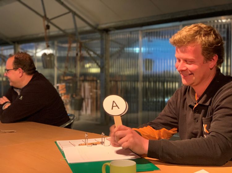 Weer is er een overduidelijke voorkeur in de zaal voor één antwoord, ditmaal voor antwoord A. 'Bijzonder dat jullie nu massaal voor antwoord A kiezen, terwijl antwoord B beter zou passen als jullie allemaal bekend willen staan als een klantvriendelijk bedrijf', aldus bedrijfscoach Pieter Peelen, die de sessie leidt. Riley Roover van RR Tuin & Design legt uit: 'Ik denk bij deze vraag aan software voor hoveniers en dan kies ik toch voor A.' Van Zon valt hem bij: 'Het is lastig voor een hovenier om te beschikken over alle informatie om erachter te komen wat er speelt bij klanten. Zoiets doen wij toch liever persoonlijk en niet via een systeem.' De derde stelling is: Ik zou willen dat de kracht van ons hoveniersbedrijf ligt in:A goed kunnen inspelen op de marktontwikkelingen, die wij vervolgens weten om te zetten in innovatieve producten of diensten.B onze voortdurende drive om de interne organisatie te verbeteren, waardoor wij zo efficiënt en snel mogelijk leveren. C het bieden van een totaaloplossing aan de klant.