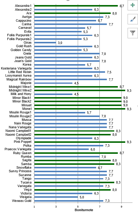 Langzaam groeiende rassen met een waardering van 8 of hoger: - 'Ara' (8,0) - 'Alexandra' (8,7) - 'Midnight Wine' (8,7 / 9,3) - 'Minor Black' (9,0 / 9,0) - 'Minuet' (9,0) - 'Monet' (9,3 ) - 'Naomi Campbell' (8,0 / 8,3) - 'Pink Poppet' (9,3 ) - 'Ruby Queen' (8,7 ) - 'Sagita' (8,0 ) - 'Samba' (8,3) - 'Tucano' (8,3) - 'Vega' (8,0) Er kon een cijfer worden toegekend tussen 1 (zeer slecht) en 10 (uitstekend) (zie grafiek).