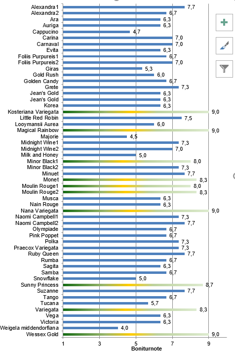| | Sierwaarde van het blad van Weigela-rassen die in Ellerhoop zijn getest, waarbij 1 = blad niet sierlijk en 10 = blad met zeer hoge sierwaarde. |