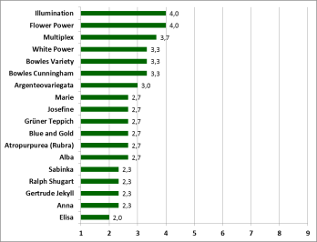 | | Gemiddelde beoordeling van de sierwaarde van de variëteiten van Vinca minor tijdens de bloeiperiode (1 = zeer kleine sierwaarde, 9 = zeer grote sierwaarde) |