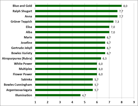 Maar niet alleen de overvloed aan bloemen - die bepaalt of een soort tijdens de bloei als decoratief wordt ervaren - is een belangrijk kenmerk van een variëteit. Het gaat ook om de combinatie met andere kenmerken, zoals bloemkleur, bloemgrootte, bloemvorm en de mate waarin de bloem harmonieert met het blad van de plant. Als rekening wordt gehouden met de sierwaarde van de rassen tijdens de bloeiperiode, is het beeld dus enigszins anders. Maar ook hier werd 'Anna' met een 7,0 uitgeroepen tot de mooiste variëteit, gevolgd door 'Marie' en 'Gertrude Jekyll', met een 6,3 voor sierwaarde van de bloem.