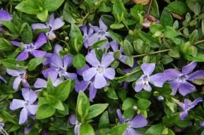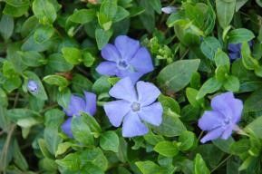 | | Vinca minor 'Blue and Gold' kwam als beste uit de bus in Ellerhoop, vooral dankzij zijn vrolijke geelgroene kleuren. |