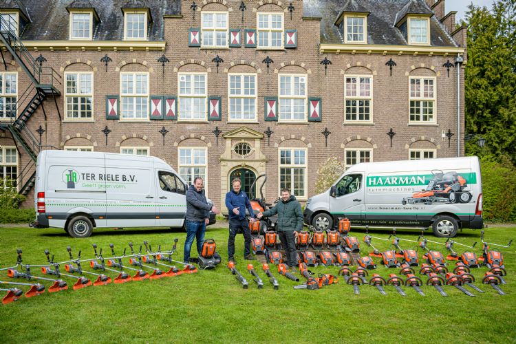 Groenvoorziener en hoveniersbedrijf Ter Riele uit Klarenbeek kiest voor zijn handgedragen machinepark exclusief voor accugereedschappen van Husqvarna. Onlangs ontvingen Wouter en Eelco ter Riele van Husqvarna-dealer Mark Haarman uit Twello een accu-assortiment met onder meer trimmers, heggenscharen, kettingzagen en bladblazers.