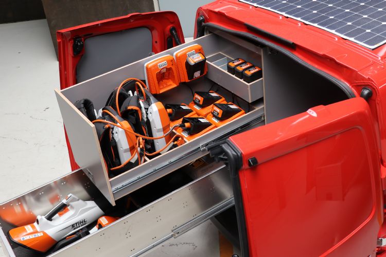 Waarom kozen de broers voor een door Brover ingerichte Toyota ProAce met een Zeliox-stroomvoorziening en Stihl-gereedschap? Volgens hen is deze Japanner momenteel het enige elektrische werkvoertuig met een actieradius van meer dan 300 km op één lading. Vaessen: 'Bovendien kun je er een aanhangwagen aan koppelen. Dat vonden we beide zeer belangrijk. Ook wilden we een dubbele cabine, zodat we er vier hoveniers met elektrisch materiaal mee op pad kunnen sturen. Zeliox de specialist in zonnepanelen en mobiele stroomvoorzieningen. Medewerkers van Vaessen zijn daardoor nog onafhankelijker van netstroom. Daarnaast is er de mogelijkheid om de accu's onderweg en op locatie van stroom voorzien.' In de Toyota ligt handgereedschap om te snoeien, te bosmaaien en te zagen. Daarbij is het zo opgeborgen dat je meteen ziet of alle Stihl-machines aanwezig zijn en dat de accu's hiervan direct voorzien worden van stroom. Er is voornamelijk met het oog op de toekomst voor het merk Stihl gekozen. Harrie Vaessen: 'We ruilen al ons handgereedschap altijd in één keer in. Meestal is dat na circa drie jaar intensief gebruik. Met deze Brover-inrichting is al het gereedschap altijd netjes opgeborgen in de bedrijfswagen en worden onze accu's altijd onderweg opgeladen. Hiervoor kunnen wij zonder zorgen een volledige dag elektrisch werken.