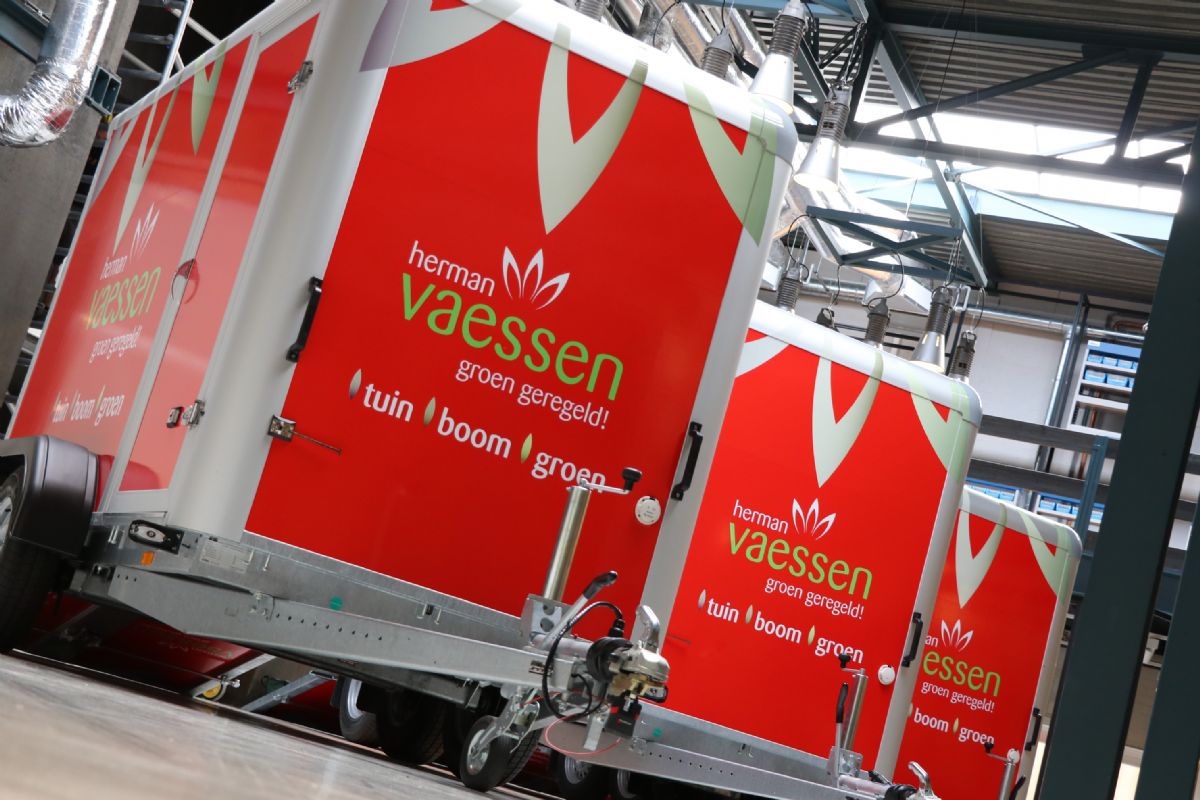 'Je komt echt met iets wezenlijks aanrijden als je opdrachtgever wil dat je een opdracht duurzaam uitvoert', licht Ralf Vaessen toe. De directeur van het bedrijf staat bij een spiksplinternieuwe Toyota ProAce-werkbus met dubbele cabine. 'De laadruimte van deze werkbus is ingericht door bedrijfsauto-inrichter Brover. Standaard liggen er vier accu-aangedreven handgereedschappen van Stihl op de schappen. Een generator ontbreekt in de werkbus, maar er zit wel een stroomvoorziening van Zeliox in.' Zijn broer en mede-eigenaar Harrie Vaessen wijst op een set acculaders die voor in de laadruimte gemonteerd zijn: 'Met deze mobiele stroomvoorziening worden de vier insteekaccu's en de twee ruggedragen accupakketten opgeladen. Hiermee beschikt de buitendienstmedewerker ook altijd over een 230V-stopcontact op de werklocatie. Het vermogen van deze Zeliox-mobiele stroomvoorziening is 3.500 W en hij heeft een capaciteit van 3,6 kWh. Met de Zeliox is er altijd en overal elektriciteit. 's Ochtends kunnen onze medewerkers dus direct in deze werkbus stappen en wegrijden, compleet met accuhandgereedschap en opgeladen accu's. Het is nu niet meer nodig om overdag via de stroommeter van een opdrachtgever accu's bij te laden.' Harrie Vaessen toont graag hoe ze tot deze innovatie gekomen zijn. Hij troont me mee naar de grootste werktuigenloods. Deze heeft zes grote en hoge overheaddeuren en is nagenoeg leeg. 's Nachts staan hier ruim 60 voertuigen ordelijk geparkeerd met de bijbehorende werktuigen en met de neus de goede kant op: richting opdrachtgevers. Dit is een belangrijke stap voor de circa 80 eigen medewerkers en de medewerkers in de flexibele schil om 's ochtends snel te kunnen starten met hun werk. Twee grote, gesloten aanhangwagens op tandemassen staan pontificaal midden in de loods opgesteld. Staande bij deze aanhangers vertelt Harrie Vaessen hoe ze tot hun innovaties gekomen zijn.