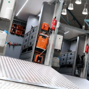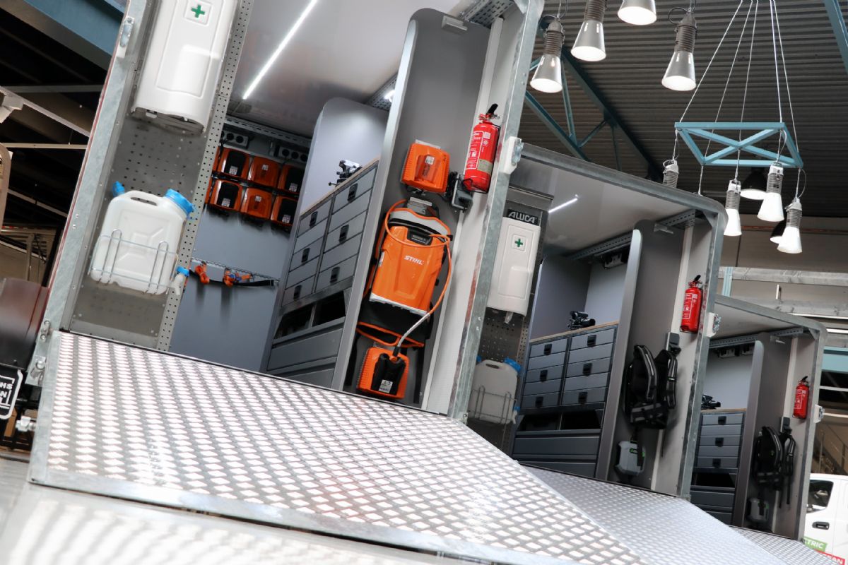 Vaessen vertelt: 'Ruim 22 jaar geleden namen wij met drie broers het familiebedrijf over. We wilden een vooruitstrevend hoveniersbedrijf zijn. Zo waren we een van de eersten die de bestrijding van de EPR professioneel aanpakten. We werken voor bedrijven, instellingen, particulieren en overheden in de aanleg, het onderhoud en de boomverzorging. We willen vooroplopen en duurzaamheid als verdienmodel is daarbij een zeer belangrijke doelstelling van ons bedrijf. Circa 600 zonnepanelen op het dak van de loods dekken sinds 2018 een groot deel van onze energiebehoefte. Onze projectleiders hebben we een elektrisch aangedreven bedrijfsauto ter beschikking gesteld. Toen er accugereedschap op de markt kwam, waren we er snel bij om daarin te investeren. Algauw kwamen we tot de conclusie dat accu's voor handgereedschap in elk geval één nadeel hebben: ze raken leeg en je moet ze opladen.' Door het bij elkaar zoeken van de benodigde accu's en het materiaal ging er 's ochtends teveel kostbare tijd verloren. Ook dat wilden ze bij Vaessen slimmer aanpakken, door alle materiaal en de te gebruiken accu's in een werkbus te laten liggen en ze in de bus op te laden. 'Vaak vervoer je voor een werkploeg van vier man het handgereedschap in de lege bak van een kleine vrachtauto met dubbele cabine', vult Vaessen aan. ''s Avonds komt deze geladen met afval en snoeisel terug. Bij gebrek aan een geschikte - elektrische - werkbus, drie jaar geleden, lag de keuze voor de hand: we lieten drie gesloten aanhangwagens inrichten met een mobiele stroomvoorziening, accuhandgereedschap en acculaders. We moesten rechtop in de aanhangers kunnen staan en in het middenpad moest er ruimte zijn voor bijvoorbeeld kruiwagens.'
