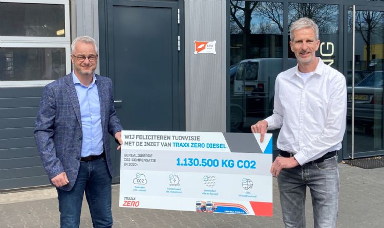 Afgelopen week ontving Tuinvisie het Traxx Zero-certificaat voor haar CO2-compensatie van 1.130.500 kg in 2020. Hugo Kok, directeur Tuinvisie kreeg het TRAXX Zero-certificaat uit handen van Leendert Verheul, directeur Transportbedrijf Verheul B.V.
