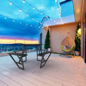 Severin Vrogten van Inter Design: 'Inter Design-buitenmeubels zijn gemaakt van hoogwaardige materialen. We gebruiken louro preto, een sterke, duurzame loofhoutsoort. Het is FSC-gecertificeerd tropisch hardhout, dat op verantwoorde en transparante wijze en onder streng toezicht wordt gewonnen in Zuid-Amerika. Louro preto is van duurzaamheidsklasse I, waardoor het buiten 25 jaar meegaat. Dit hout heeft een geelbruine kleur en glanst een beetje. In combinatie met staal geeft dit een chique, maar ook uitnodigende uitstraling.'
