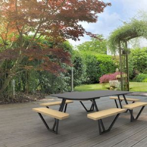 FIBER bestaat uit verschillende picknicktafels. De tafelbladen uit deze lijn zijn van HPL gemaakt, de zitting is naar keuze van HPL of iets exclusiever ogend hout. Het FIBER-onderstel is evenals dat van BLOCKS universeel. Je kunt de poten ook aan elkaar koppelen om een langere set te maken. Vrogten: 'Inter Design start met drie opties: een standaardopstelling voor acht personen, een hogere statafelopstelling met een zitje, zoals je wel ziet bij bedrijfsborrels, en een langere editie, waarbij bijna twee standaard FIBER-tafels aan elkaar gekoppeld zijn. De FIBER-lijn is uit HPL gemaakt, zodat de meubels makkelijk schoon te maken zijn, bijvoorbeeld na een bedrijfsborrel of nadat bezoekers van een recreatie- of pretpark eraan hebben zitten eten.' LIGNA is een sierlijk bankje met gebogen stalen strips, die het wat bewerkelijker maken, maar ook een exclusieve uitstraling geven.