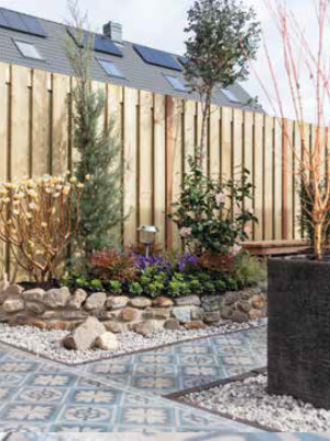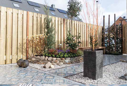 Genieten in een tuin vol zitcomfort, bloemen, planten en watermanagement |