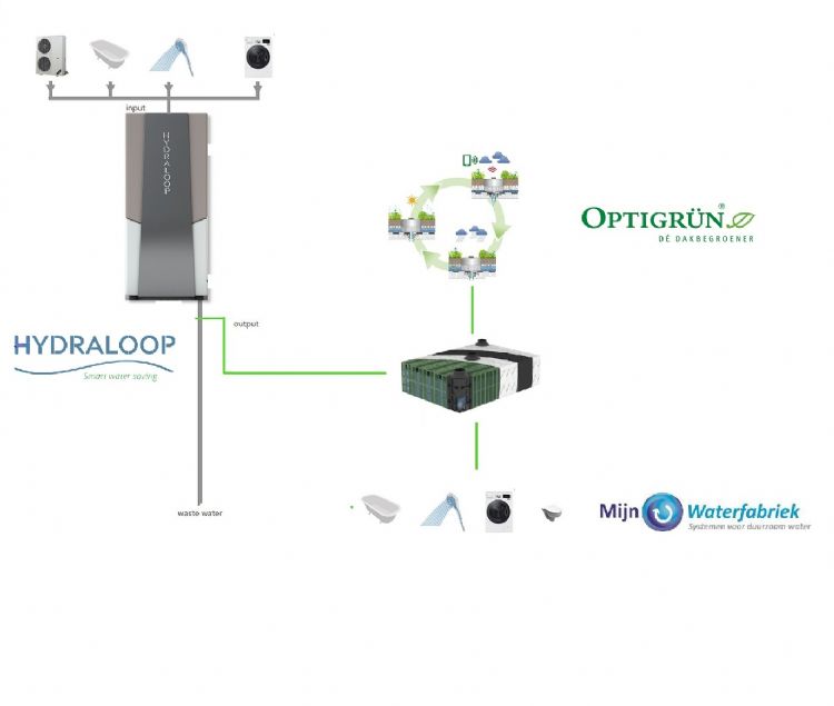 Omdat er in langere periodes van droogte watertekort kan ontstaan, wordt het waterniveau aangevuld door Hydraloop. Dit prijswinnende systeem voor grijswaterrecycling verzamelt het water van douche, bad, wasmachine en condenswater van de wasdroger. Het water wordt via een speciaal proces gereinigd en kan vervolgens hergebruikt worden - bijvoorbeeld voor het spoelen van toiletten, om de tuin te irrigeren én om eventuele watertekorten op de kavel en kelderdek op te lossen. Hierbij wordt water wat gebruikt is voor wasmachine, douche, bad en condenswater van de wasdroger middels een speciaal proces gerecycled en naar de Optigrün RigoCollect tank gestuurd. Dit water kan dan weer gebruikt worden om het watertekort op de kavel en kelderdek op te lossen.