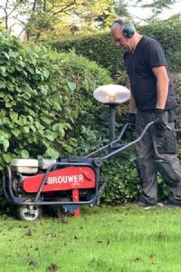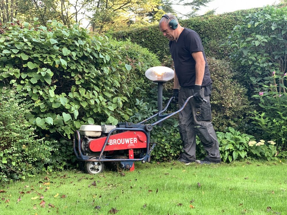 De eerste stap is het verwijderen van het bestaande gras. Voor deze klus wordt een Brouwer-graszodensnijder gebruikt met een werkbreedte van 33 centimeter. De Zoete: 'Je wilt de harde ondergrond zo veel mogelijk handhaven; daarom verwijderen we echt alleen het gras. Sommige partijen graven wel 10 tot 15 centimeter af voor het aanleggen van kunstgras. Dit is niet alleen onnodig, het geeft ook meer risico op verzakkingen en leidt tot veel te hoge kosten voor de klant.' Door met een graszodensnijder te werken, zorg je dat er overal ongeveer evenveel vanaf wordt gehaald. Na het lossnijden van het gras worden de graszoden verwijderd met schop en kruiwagen.