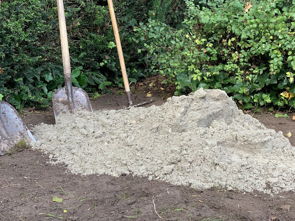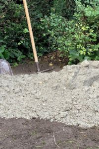 Na het verwijderen van het gras wordt er opvulzand gestort. Hiervoor gebruiken de mannen van Kunstgrasboer.nl stratenmakerszand. Dit wordt met kruiwagens op de ondergrond gestort en met de hark verspreid. Voor deze zandlaag houdt het aanlegteam geen vaste dikte aan. De Zoete: 'Het is puur bedoeld als egalisatielaag; de ene keer heb je 4 centimeter zand nodig, de andere keer 6 centimeter. Het beste is om een zo dun mogelijke laag te maken; dan maak je gebruik van de bestaande harde ondergrond.' De Zoete schat dat hier zo'n 1,5 kuub grond is gebruikt voor een oppervlakte van 52 vierkante meter.
