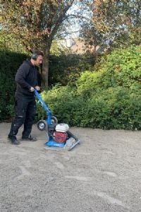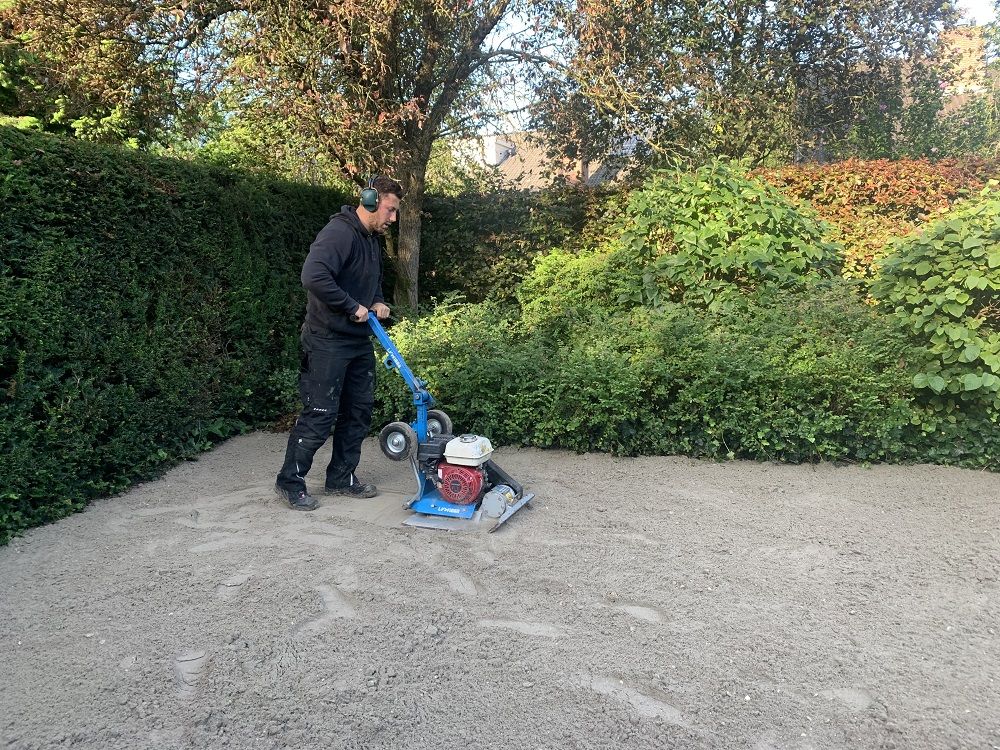 Stap drie is het egaliseren van de zandlaag. Hiervoor wordt in eerste instantie een hark gebruikt. Daarna wordt het zand met een waterpas geëgaliseerd, om vervolgens te worden aangetrild met een trilplaat. Op deze locatie zijn verder weinig bijzonderheden; overal een à twee keer trillen is genoeg. De Zoete: 'Als er bijvoorbeeld ooit een vijver is geweest, is het zaak om alles goed aan te trillen; anders treden er uiteindelijk verzakkingen op.' De klus wordt hier geklaard met een LVW1800 Revo-trilplaat.
